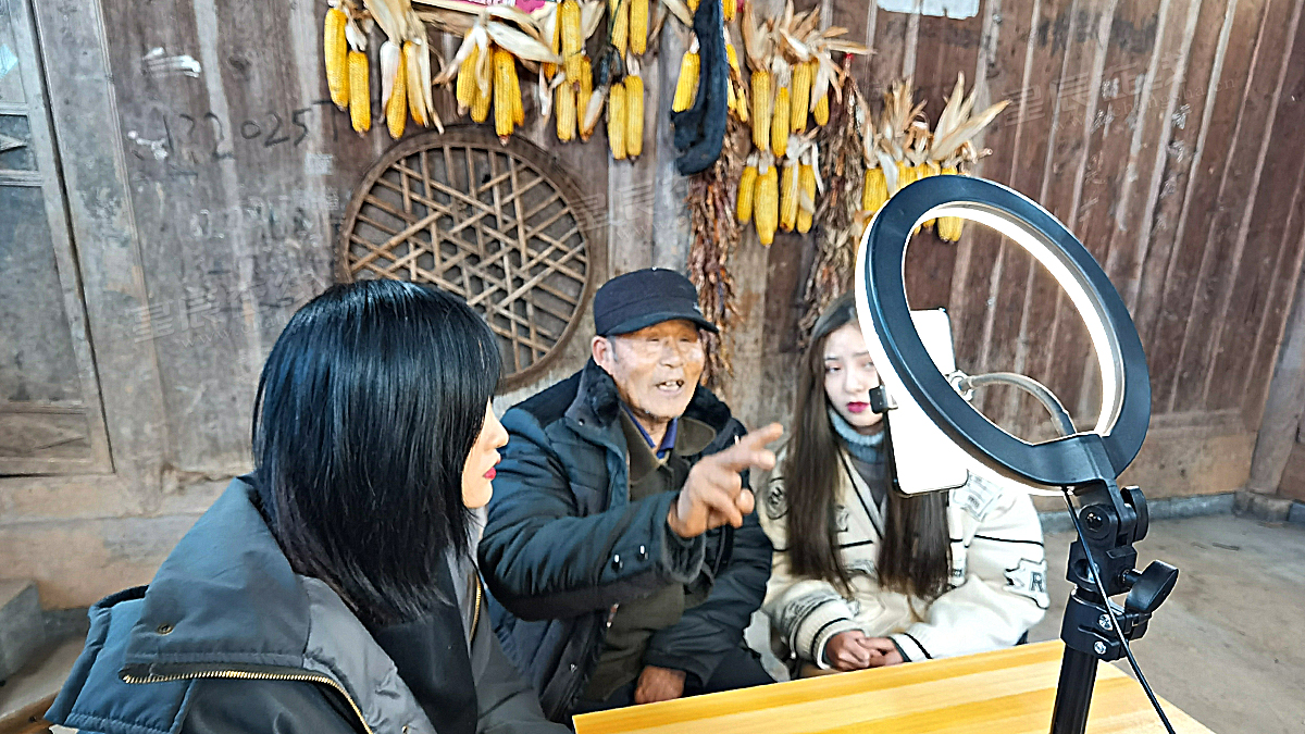 为了搭建网红网络直播室,剧组成员在村中乡亲家中借辣椒、玉米、农具作为装饰直播间的“道具”。