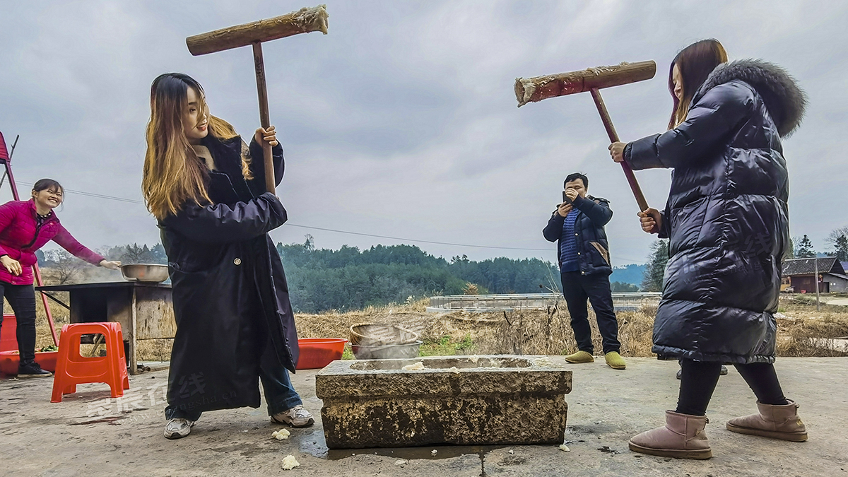 拍摄杨木村村民打糍粑时,两位摄制组的“女汉子”也忍不住上锤帮忙。