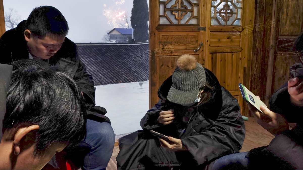 除夕夜,剧组人员围坐在房间等待每天讲评会议的召开,外面已经燃起了璀璨的焰火。